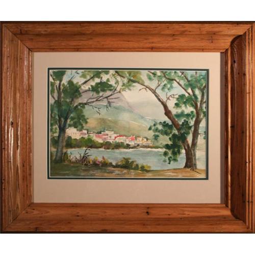 ?Jet Propulsion Lab, Pasadena? is an original, impressionistic landscape painting by talented artist E. Kemmer. The landscape is rich with lush shades of green as the viewer is invited to look through the trees and across the water at the sprawling propulsion lab. Strokes of red line the rooftops of some sections of the lab, providing a wonderful compliment to the varying greens in which the building is ensconced. The painting has been double matted in deep hunter green and medium beige to echo the deep greens within the composition, and to enhance the lighter tones. The piece is handsomely framed in medium oak wood which reinforces the naturalistic theme of the landscape and brings the total dimensions to 25? x 21.? The unique matting and framing presentation of this piece was individually selected and created by Le Chateau?s renowned master framer, Jeanette Shoenrock, and bears her signature on the back. E. Kemmer?s signature can been seen in the lower right corner of the piece just beneath a large tree. A tag on the back of the painting reads, ?Jet Propulsion Laboratory Pasadena, From Oak Creek Park 1967, JC Wright.? ?Jet Propulsion Lab, Pasadena? is a wonderful original painting that is available to you at a bargain price. Do not let the chance to make it part of your collection pass you by!