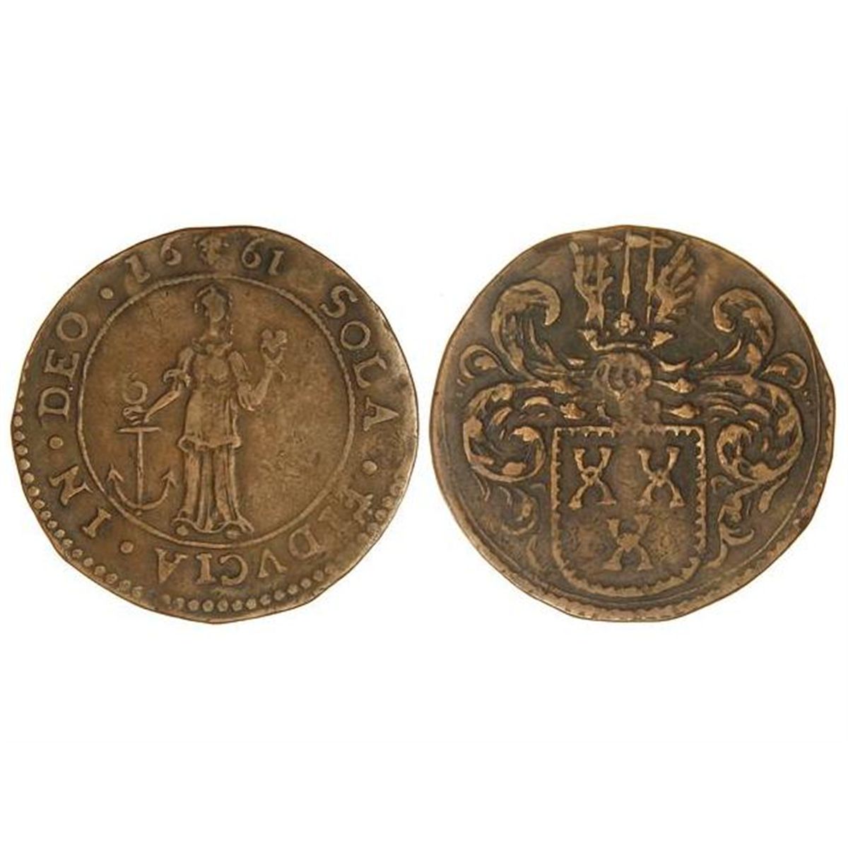 Jetón. - 1661. - Anv.: SOLA.FIDUCIAIN.DEO. Figura con ancla y corazón. Rev.: Escudo de armas. AE. Ø27 mm. MBC. - -