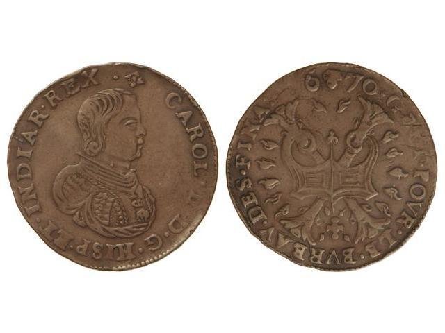 Jetón. 1670. BRUSELAS. Anv.: Busto de Carlos II a derecha. Rev.: Escudo de cruz de Borgoña coronada. AE. MBC.