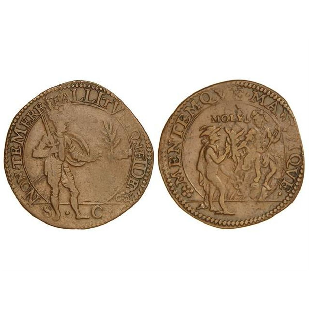 Jetón. - S/F (1607). - DORDRECHT. - Anv.: NON.TEMERE FALLITVR NON FIDENS S.C. Caballero recibiendo rama. Rev.: MENTEMQVE.MANVMQUE. Figura recibiendo rama de caballero. AE. Ø30 mm. MBC. - -