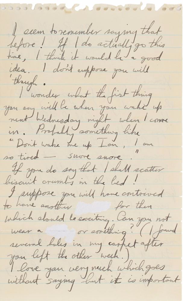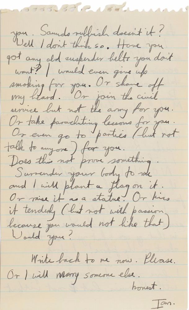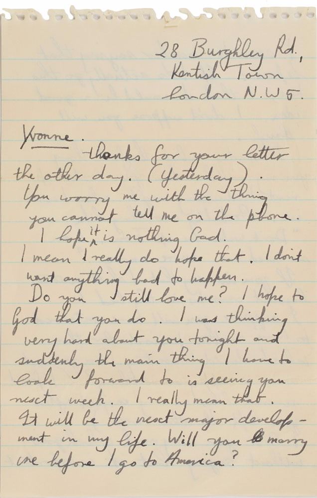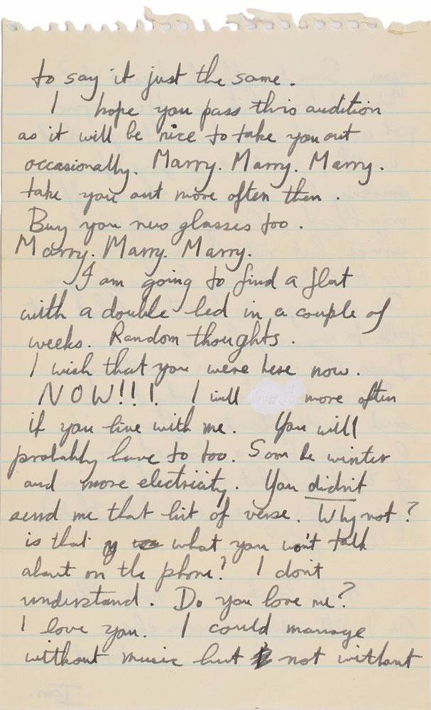 ALS signed “Ian,” 5 x 8, no date, but circa 1967–68. Letter to his girlfriend Yvonne Nicholson, in part: "Do you sill love me? I hope to God that you do. I was thinking very hard about you tonight and suddenly the main thing I have to look forward to is seeing you next week. I really mean that. It will be the next major development in my life. Will you marry me before I go to America? I seem to remember saying that before! If I do actually go this time, I think it would be a good idea. I don't suppose you will though…I hope you pass this audition as it will be nice to take you out occasionally. Marry. Marry. Marry. Take you out more often then. Buy you new glasses too. Marry. Marry. Marry. I am going to find a flat with a double bed in a couple of weeks. Random thoughts. I wish that you were here now. NOW!!!…You didn't send me that bit of verse. Why not? is that what you won't talk about on the phone? I don't understand. Do you lobe me? I love you. I could manage without music but not without you. Sounds rubbish doesn't it? Well I don't think so…I would even give up smoking for you. Or shave off my beard. Or join the civil service but not the army for you…Surrender your body to me and I will plant a flag on it. Or raise it as a statue. Or kiss it tenderly (but not with passion because you would not like that) Would you? Write back to me now. Please. Or I will marry someone else. Honest." A few words covered over with white-out. In fine condition.