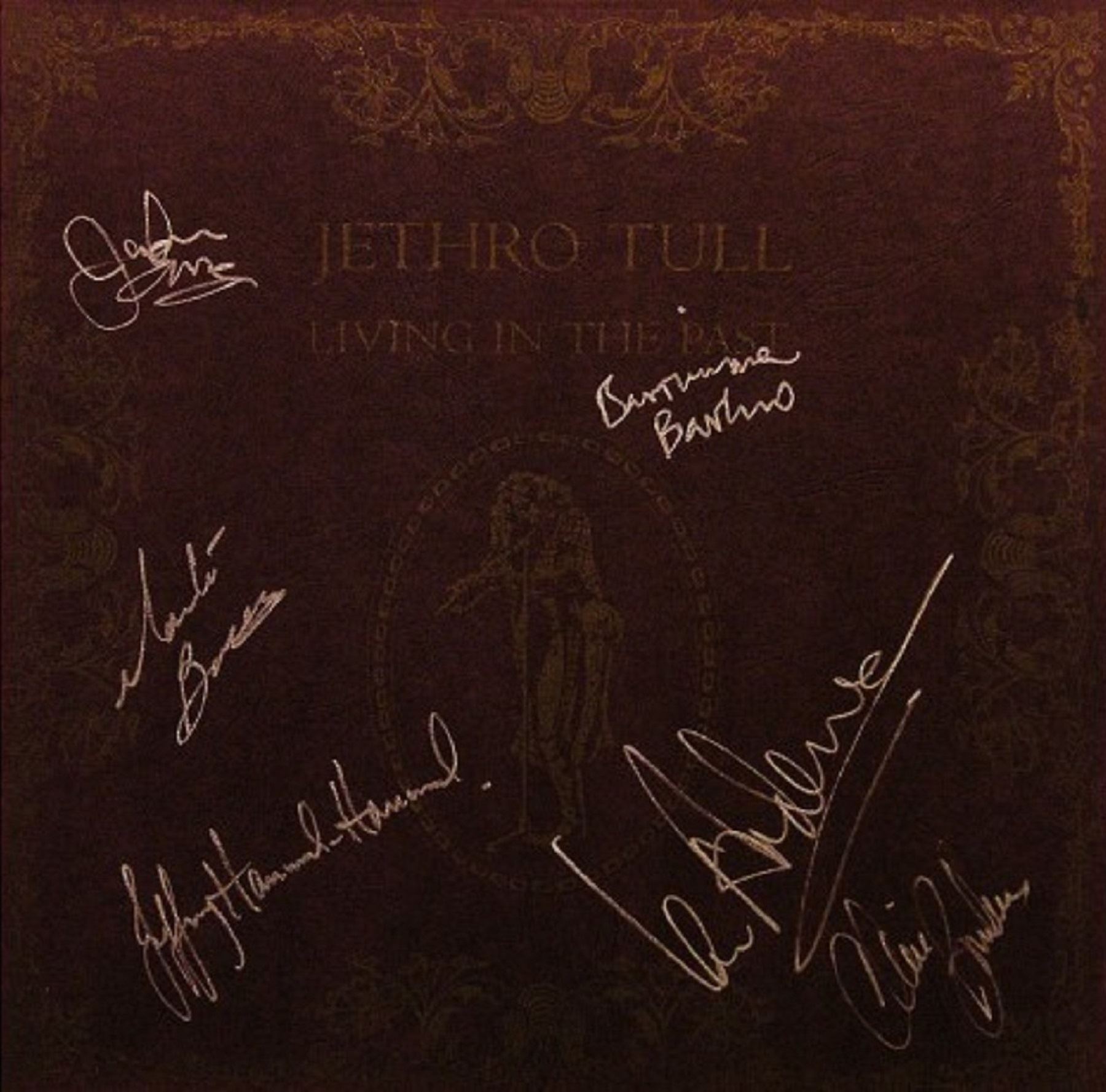 Jethro Tull's 1972 hit album "Living In The Past" autographed by Ian Anderson, Martin Barre, John Evan, Jeffrey Hammond-Hammond, Barriemore Barlow, and Clive Bunker.