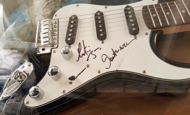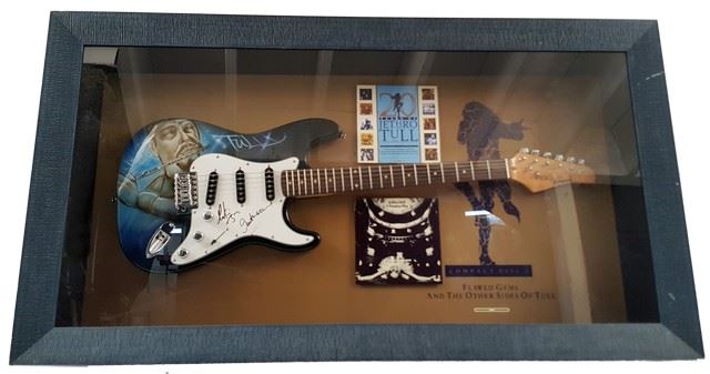 "Jethro Tull" framed and autographed "Focus by Kramer" guitar painted with custom airbrush artwork. Beautifully created and framed in a blue wooden shadow box. Includes certification. Measures approximately 26" x 48".