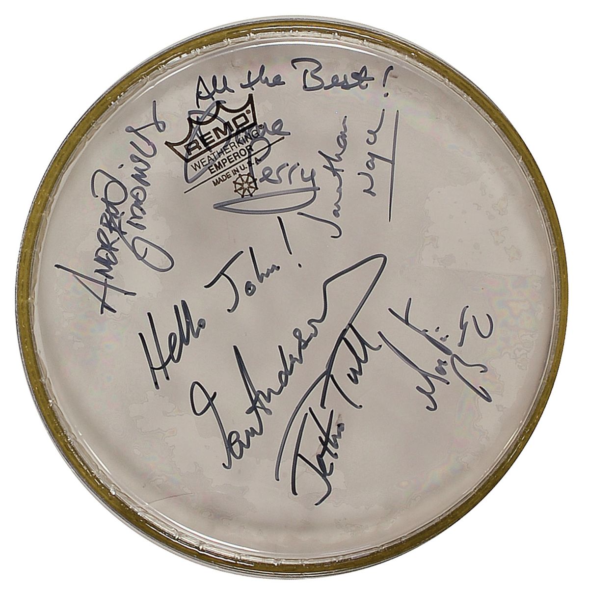 Unused 8? clear Remo drumhead, signed in black felt tip by Ian Anderson, adding “Hello John! Jethro Tull,” Martin Barre, Doane Perry, adding “All the Best!,” Jonathan Noyce, and Andrew Giddings. In fine condition, with light contrast to a portion of Perry’s signature over the label.