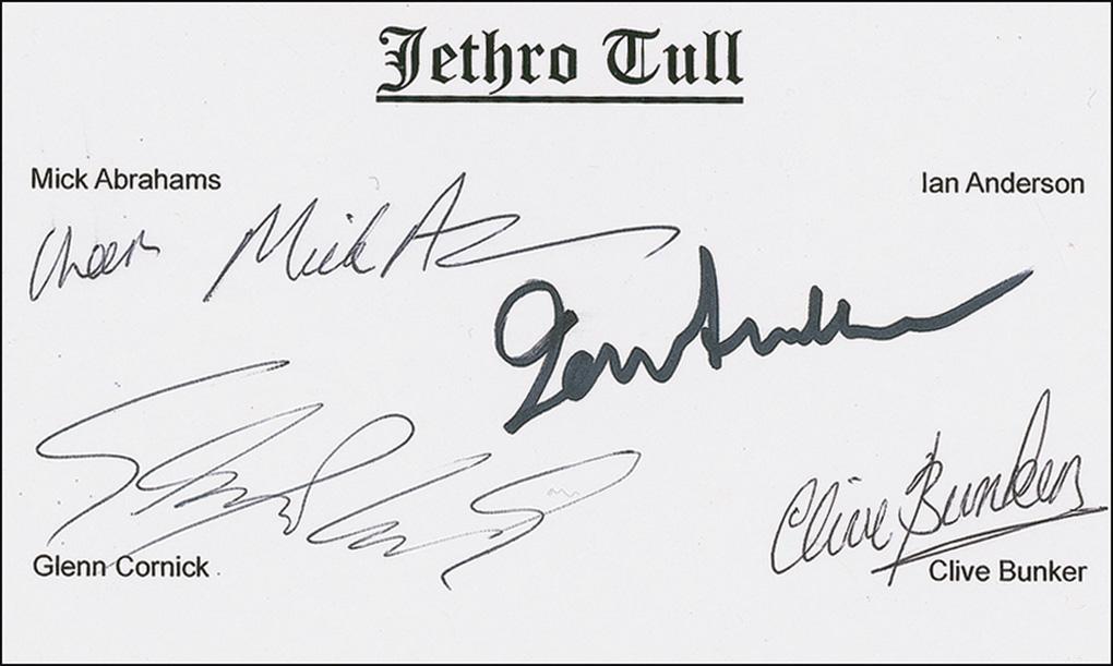 Ink and felt tip signatures of original band members Ian Anderson, Mick Abrahams, Glenn Cornick, and Clive Bunker on an off-white 5 x 3 card. In very fine condition. Scarce offering of the original Tull.