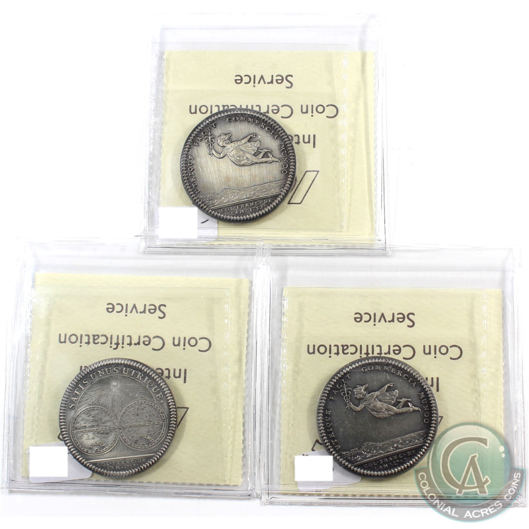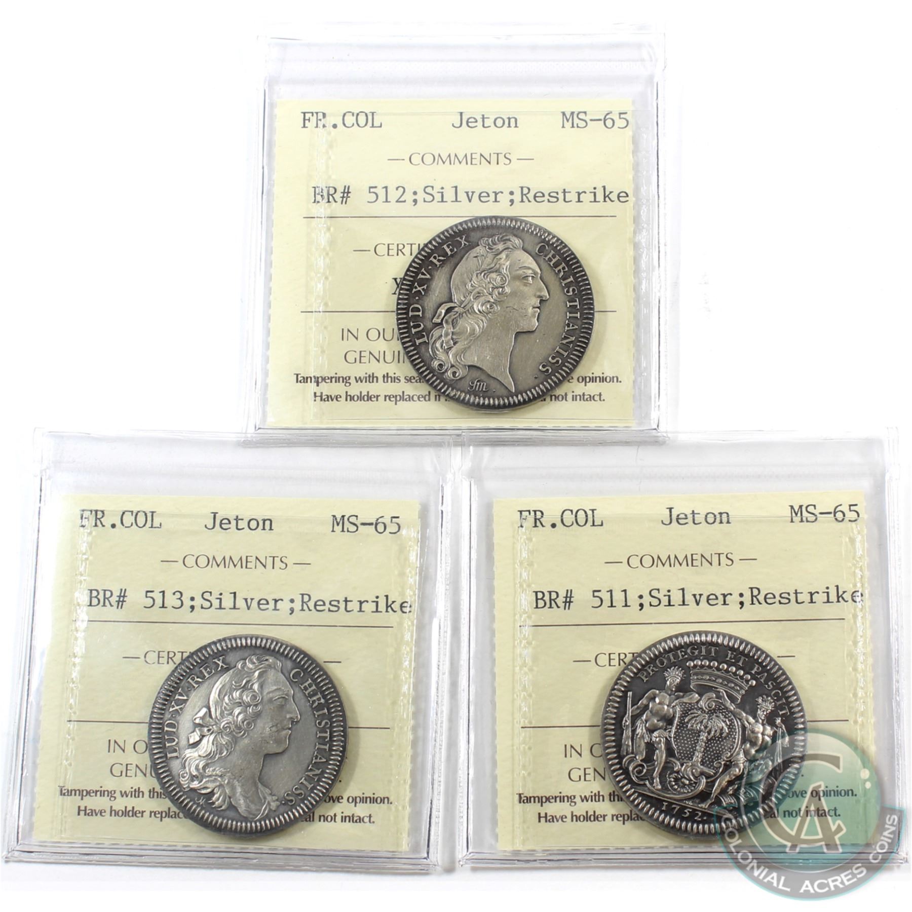 Jetons: Breton 511, 512 & 513 Silver Restrikes French Colonies ICCS Certified MS-65. 3pcs