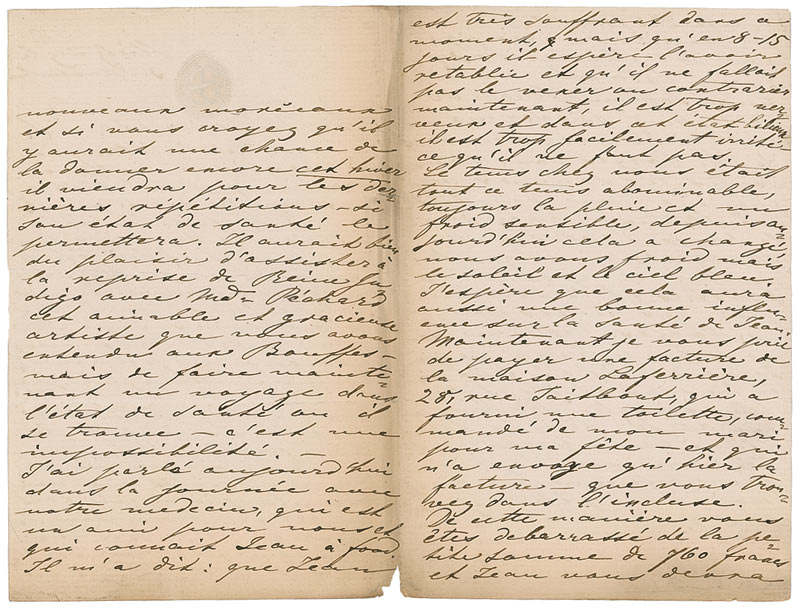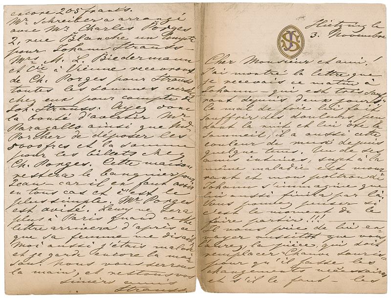 First wife of Johann Strauss II (1818–1878). ALS in French, signed “Strauss,” four pages on two adjoining sheets, 5.25 x 8, personal letterhead, November 3. Untranslated letter to a gentleman regarding the operettas of Johann. In very good condition, with scattered toning and soiling, heavier along left edge and partial separation to hinge.