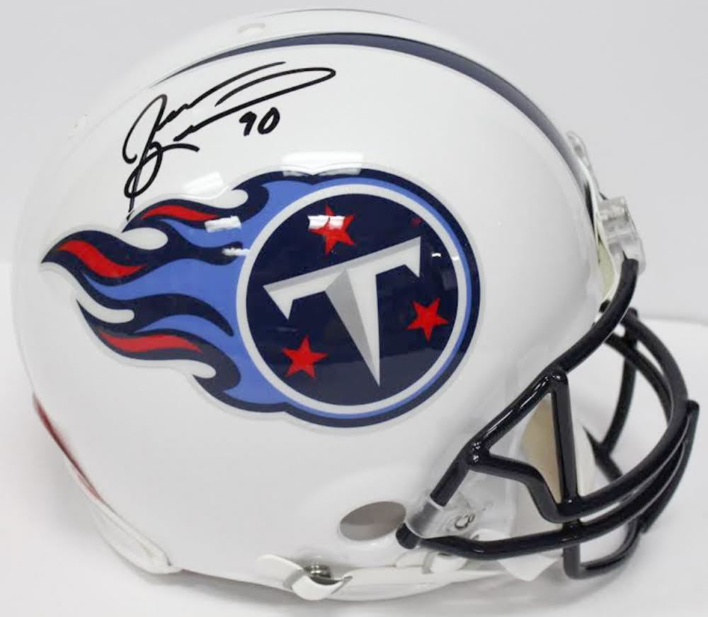 Tennessee Titans full-size authentic on-field speed helmet. Hand-signed in black felt-tip pen by Jevon Kearse.