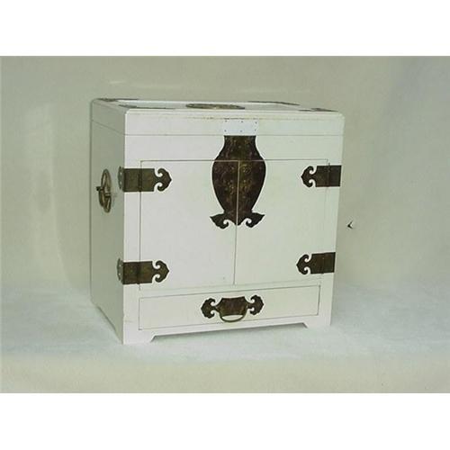 Large oriental style wood jewel box, 15" tall, 9 1/2" wide, 15" long, with six drawers and lift top, interiors lined with green velvet, central doors open to reveal five compartmented drawers, also lined. Lock included but mechanism not working. Brass decoration on exterior can be polished. Some scars to paint on top.