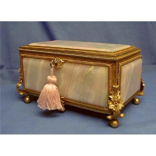 This pastel colored onyx jewel box is delicately hued in candy colors and lined in a pale pink "watered silk". The rectangular shape is framed in pellet beaded dore bronze encasing beveled edge onyx panels. Shipping/Insurance will be quoted at the time of purchase and are the responsibility of the purchaser.