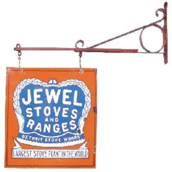 Jewel Stoves & Ranges double sided porcelain hanging sign, B.S. Sign Co., Chicago, some spots where porcelain is missing & one area of restoration, overall Good+ condition, 24"Sq.