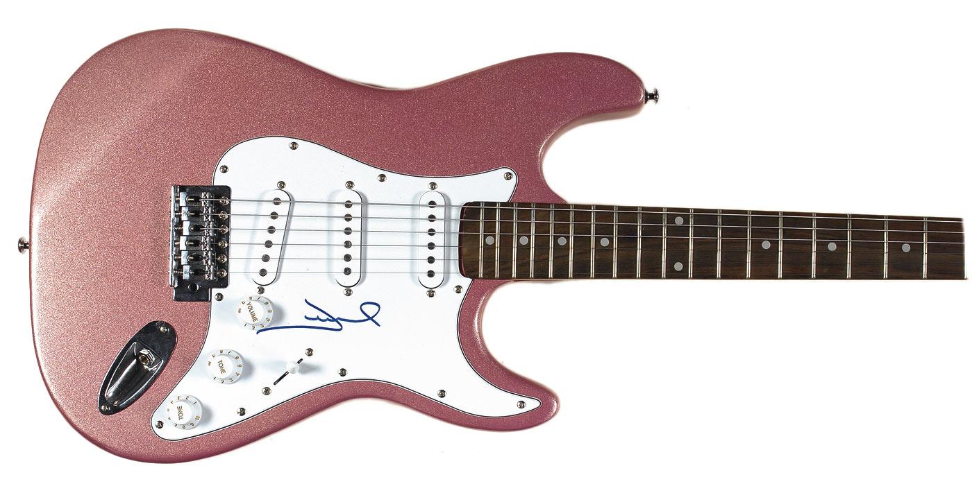 Pink-bodied Austin Bazaar ‘stratocaster-style’ electric guitar, signed on the white pickguard in blue felt tip. In fine condition. Oversized. RRAuction COA.