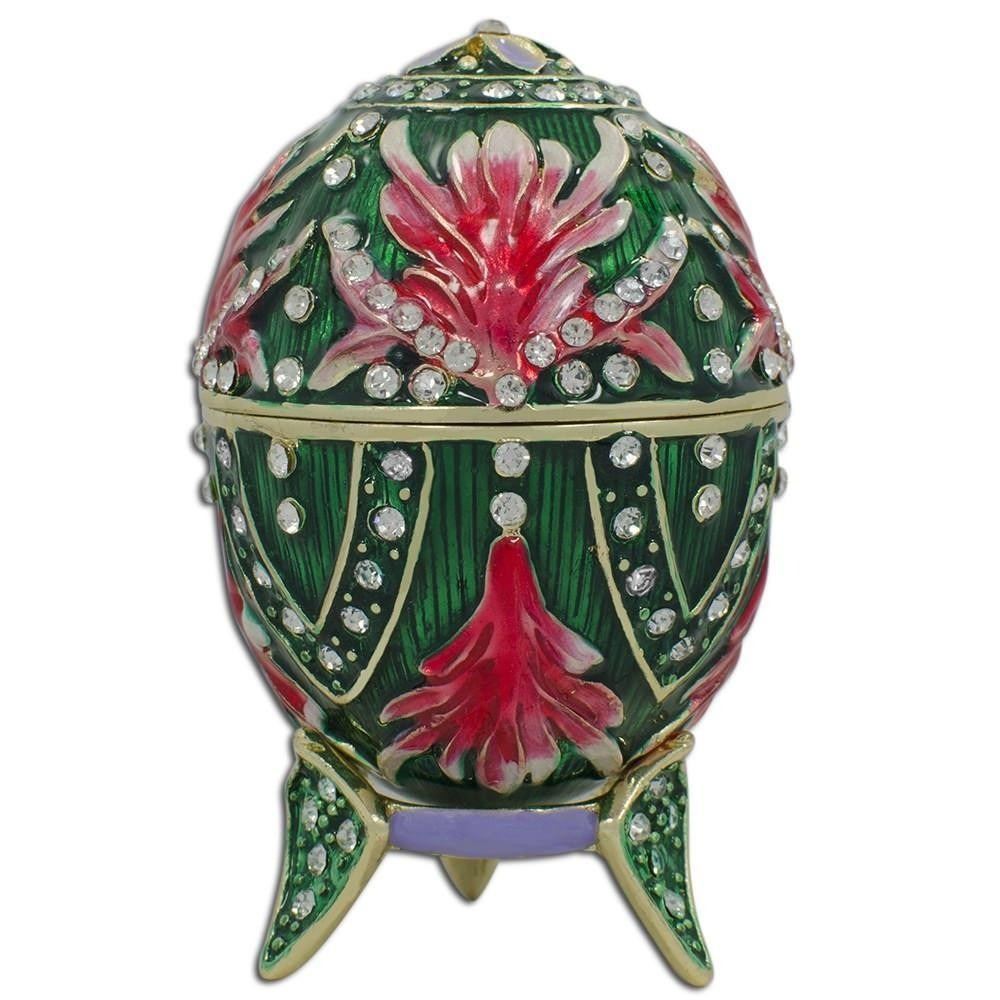 3.5" Jeweled Amaryllis Flowers Royal Inspired Russian Egg 3.5'' (H) Pewter, Crystals, Enamel Gift Boxed This sparkling egg is adorned with clear crystals and high-polished enamel with golden trim. It opens on a hinge and has a magnetic closure to keep the box securely shut. The piece also comes in a beautiful gift box.