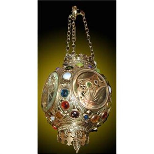</font></strong>Very elegant work of art. Magnificent brass workmanship. Beautiful jewels. One glass panel is cracked. Originally a gas light, now with modern electrification.</font>