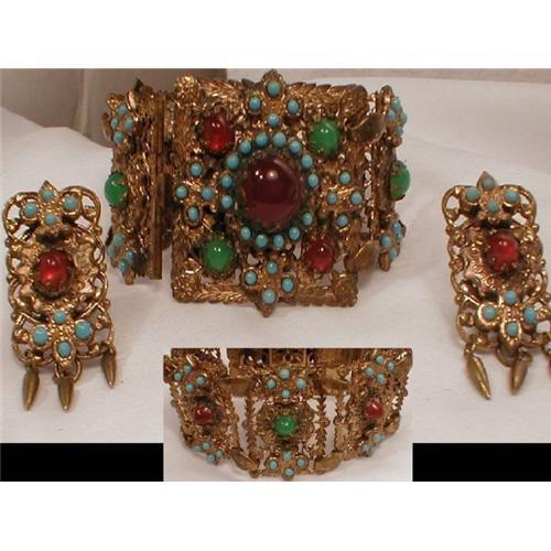 Many people rarely get to see De Rosa jewelry much less own any. And once you own one you will see why they are rarely re-sold. This one has the Egyptian theme Turquoise and carnelian and chrysoprase cabs that raise up off the highly ornate brass filigree and metal work. The bracelet is 1 3/4" wide and when you see it thru the back you think you are looking thru exotic metal lace. The has a front hidden clasp and it measures 6 3/4" long. The matching earrings are the old clip style and they are 2" long with victorian metal tassels. The set is in great shape and looks like it came right out of a jewelry museum. Don't miss out on this one, I doubt it lasts long.