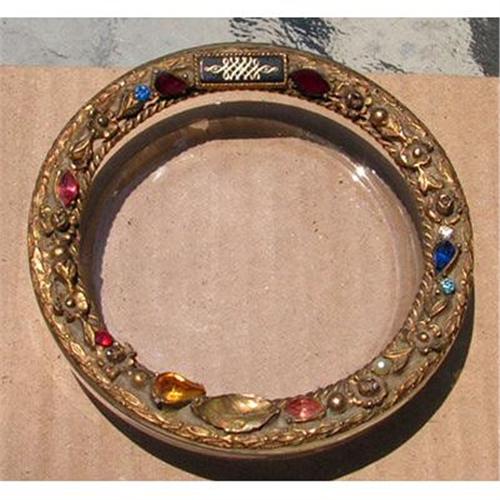 This lovely glass trinket bowl or dish features an ormolu, brass, bronze or gold rim replete with an ornate mixture of pretty colored glass jewels, gold flowers, leaves, other decorations and a braided border. Measuring 3 3/4" in diameter x about 3/4" tall and is in excellent condition