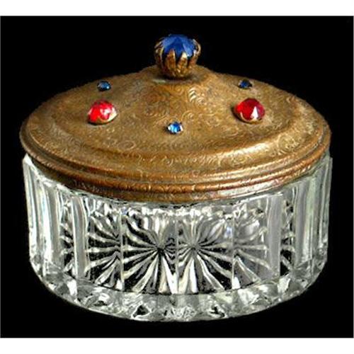 Produced circa 1930 this beautiful brass or ormolu dresser or vanity jar features a fancy scrolled flower pattern lid adorned with blue and red glass jewels and topped with a large prong set blue glass jewel. The heavy crystal jar has a ribbed body and a starburst bottom. Measures 3" tall x 4" wide and is in excellent condition