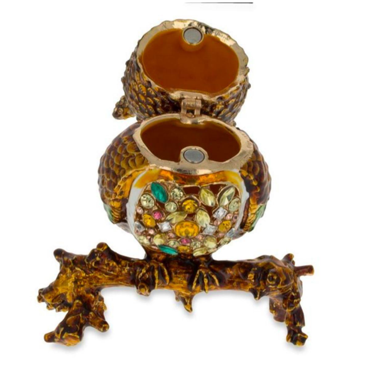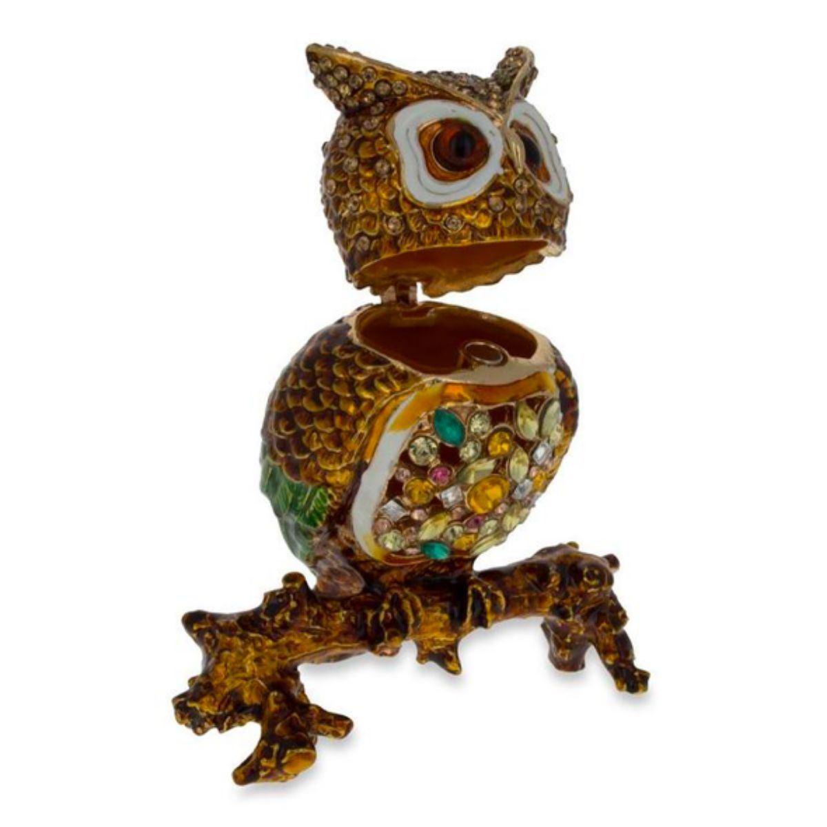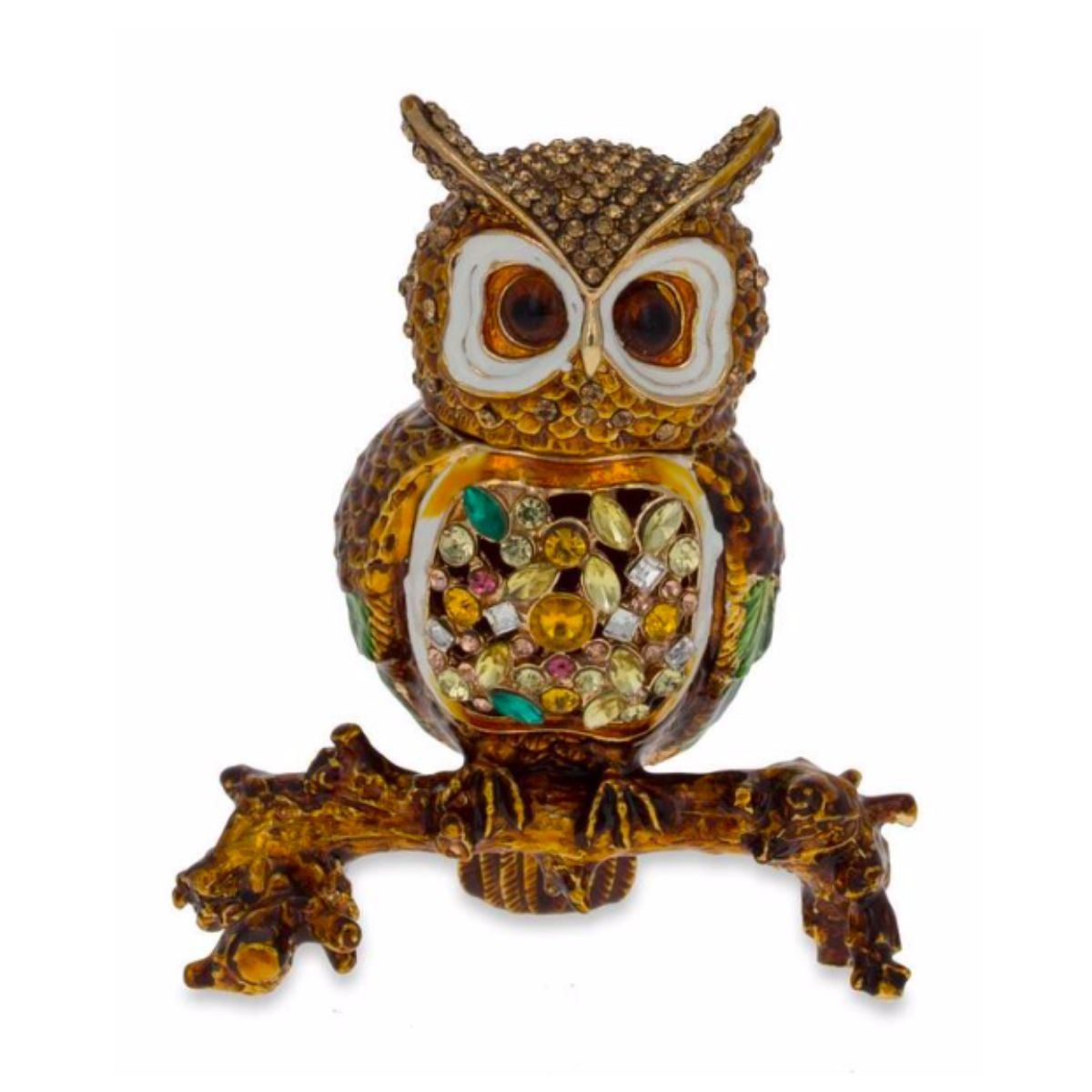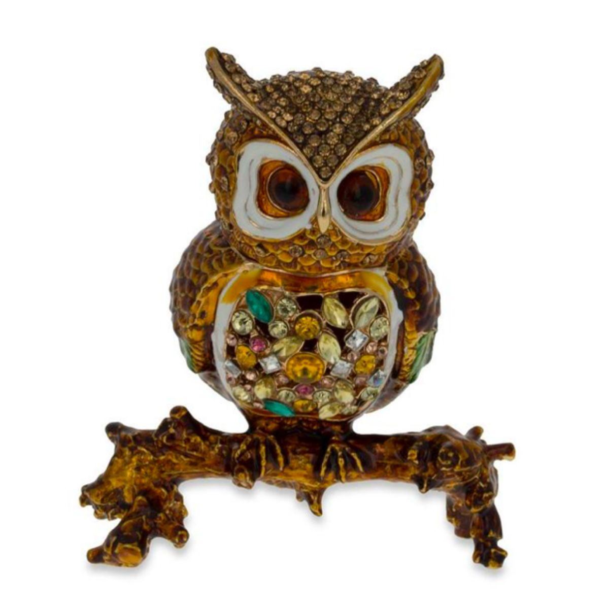 Little jeweled owl sitting on a branch, trinket, jewelry box. Enamel & gilt over pewter, with embedded Austrian crystals. The head of the owl lifts up ( with magnetic closure, to reveal an enameled interior for storing items. 3" W X 3 1/2" H. Comes with gift box.Â