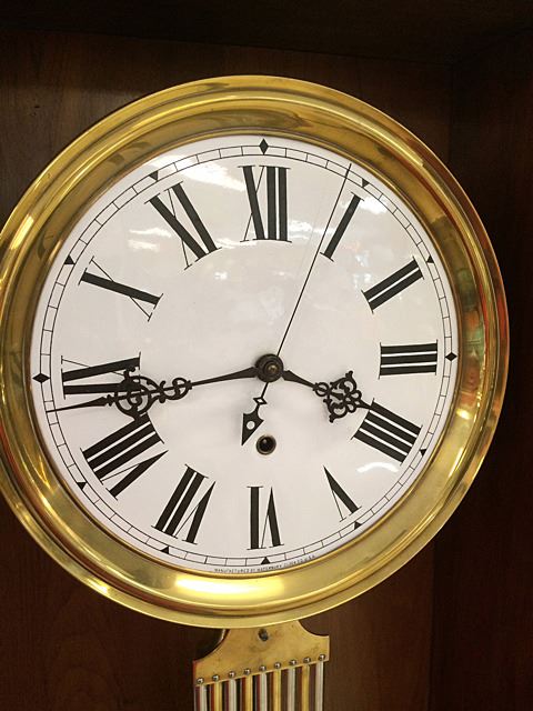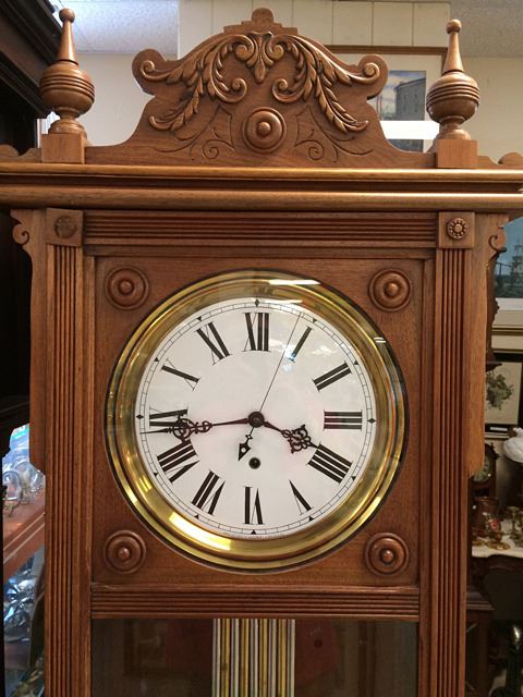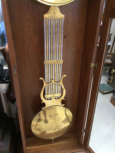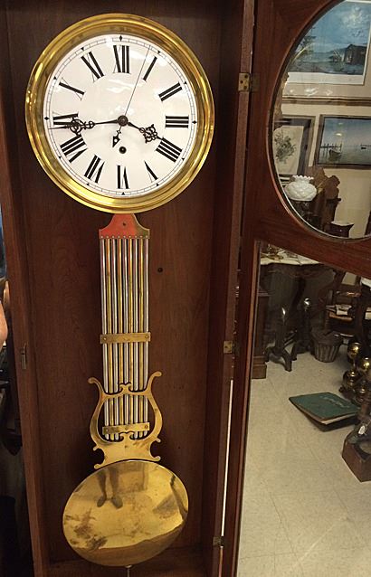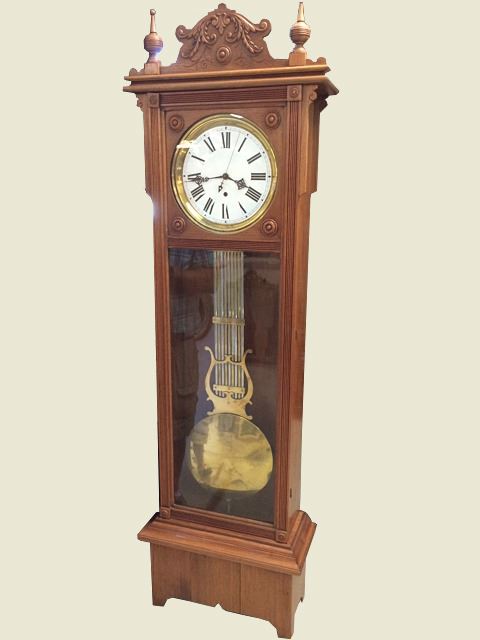 Jeweler's Floor Standing Regulator Clock by Waterbury Clock Co., Waterbury, Connecticut. Sweep hand, porcelain dial, Lyre Gridiron Pendulmum, Walnut case with carved top and finials. These clocks were made for jewelry stores because the would keep very accurte time. This clock is in running order, measures approx. 82" tall.