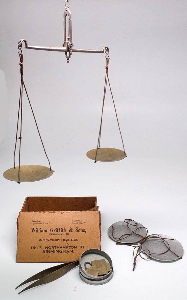 c1920 From William Griffith & Sons. Manufacturing Jewelers. 15-17, Northampton St. Birmingham. The weights come in the original box, complete with a scale and set of weights. The box has some wear and some of the pieces have fallen apart. - HKA#66223