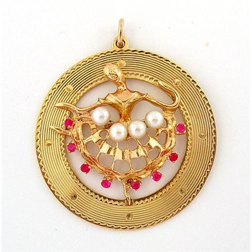 This large gold charm displays a dancing ballerina against a large ribbed circular band. The dancer's arms are gracefully extended, and she stands en pointe on her left leg while her right leg is turned out 90 degrees. Four cultured pearls appear around her waist. Eight rubies decorate the hem of her openwork tutu. There are no marks, but tested to be 14Kt. gold.