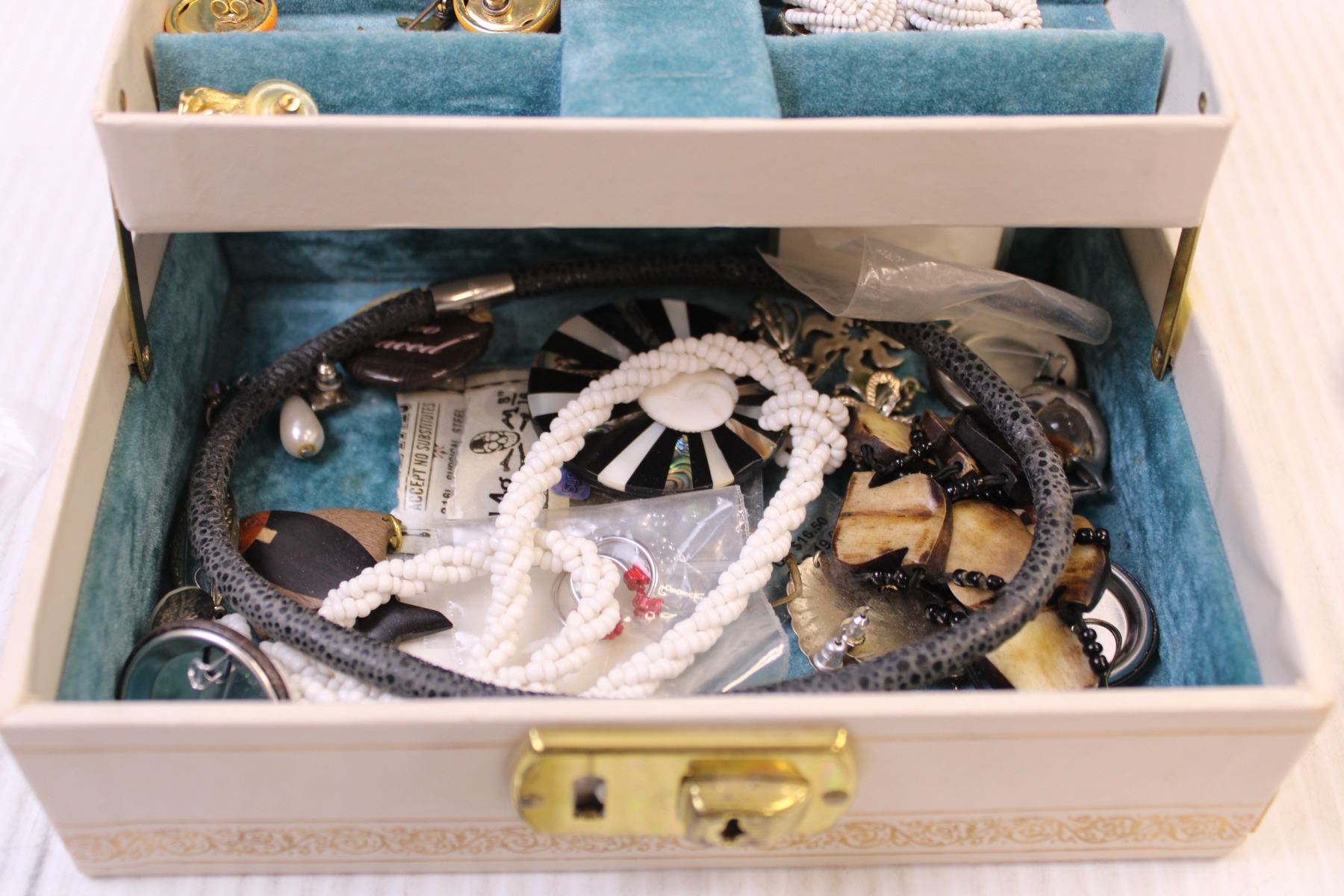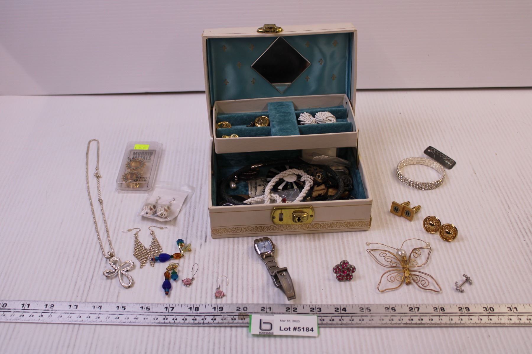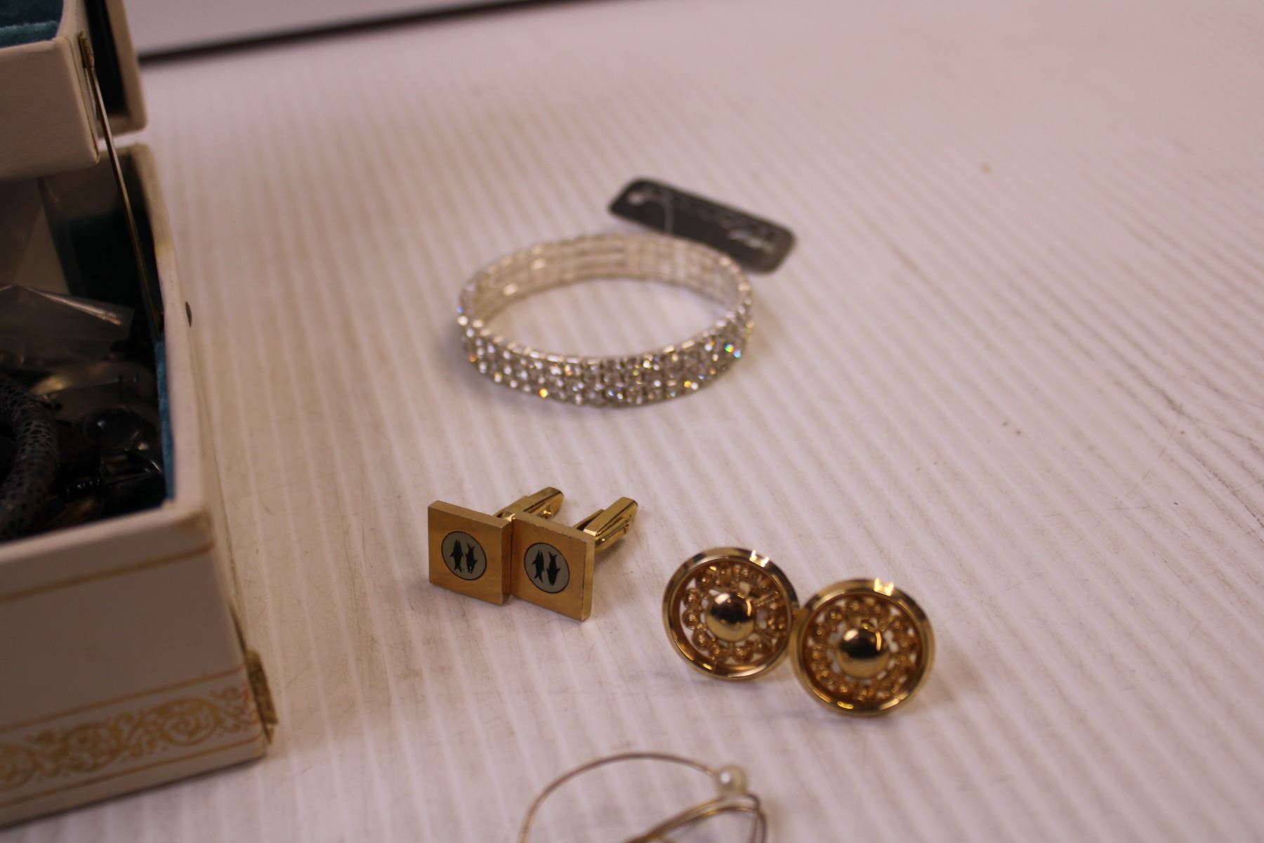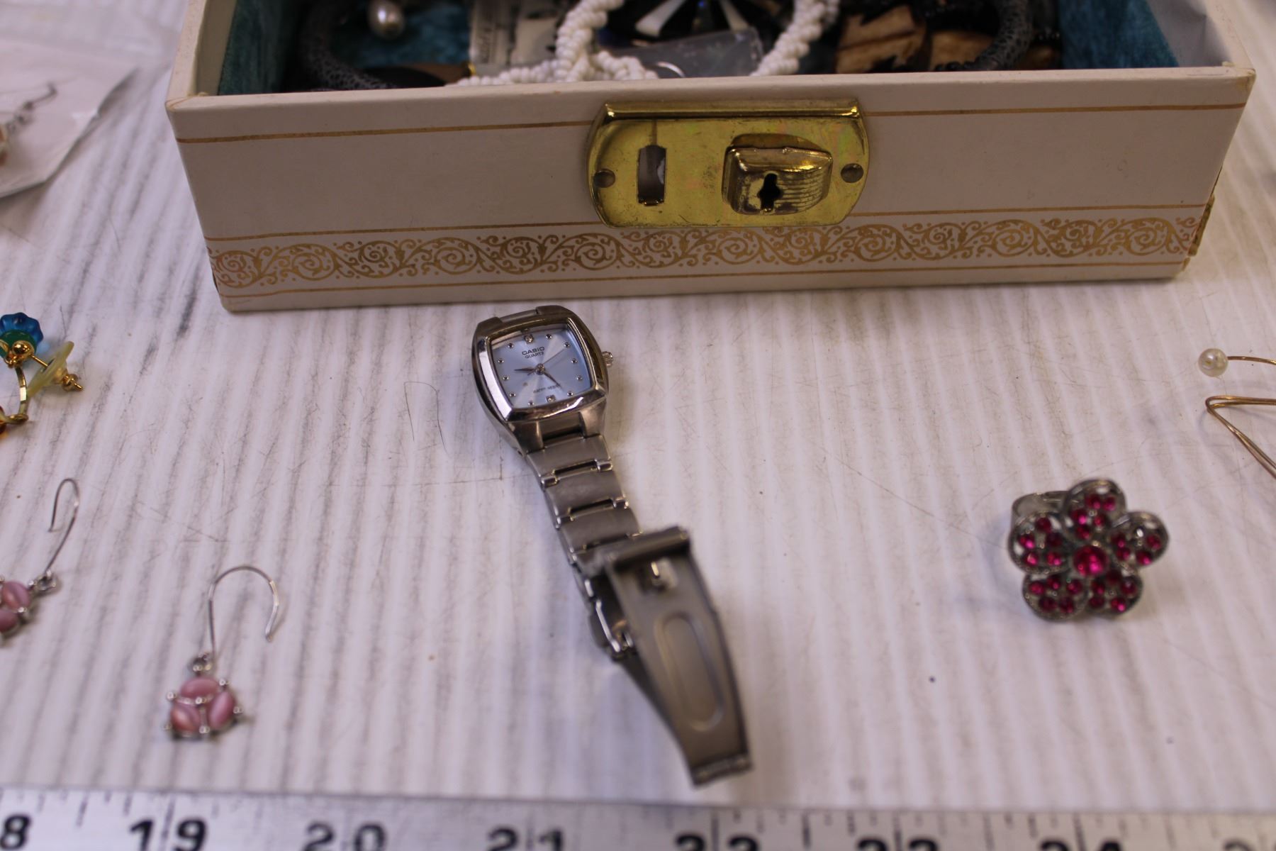 Jewellery Box w/ Mix of Costume Jewellery, Cufflinks, Gauge Earrings, and a Casio Watch