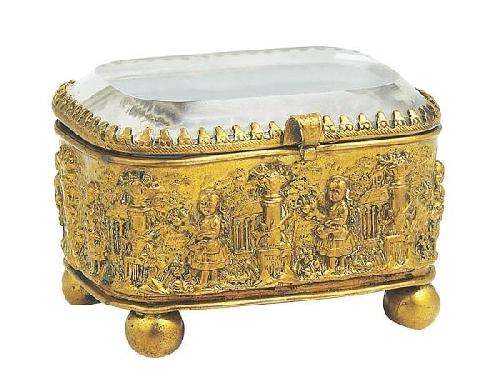 Gilt brass, cut glass cover. Rectangular form raised on four feet, round on the sides there is a pressed -repeating- scene: girl with basket and bunch of flowers. The silk lining is worn. German, late 19th century. Size: 7 x 5 x 4 cm