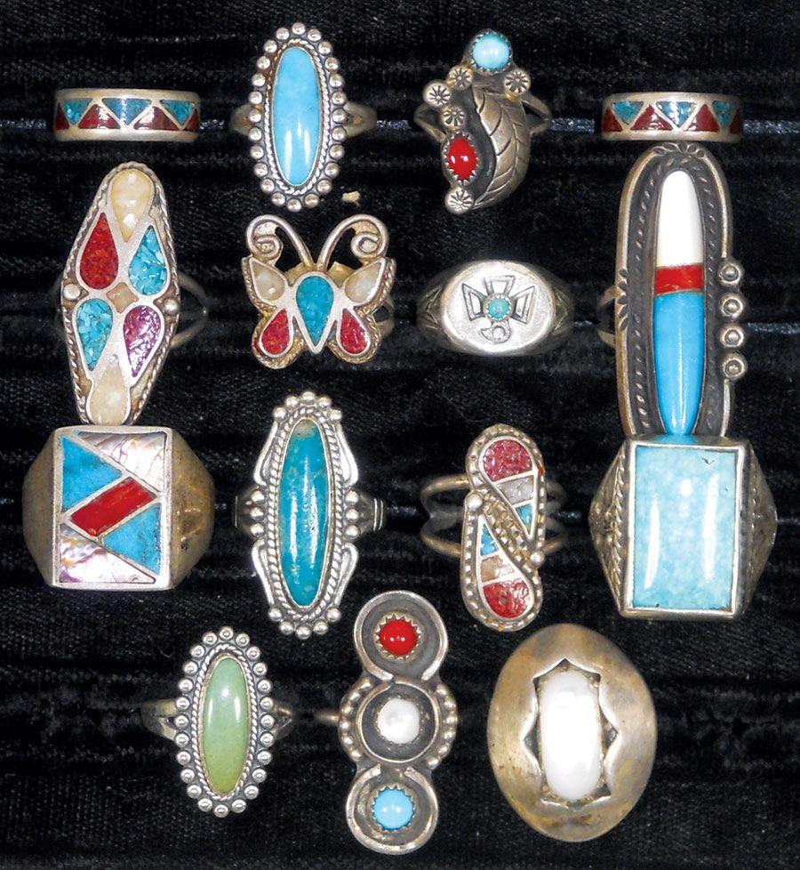 Jewelry, (15) rings w/turquoise, onyx & mother-of-pearl stones, all different styles & sizes, a great assortment in Exc cond.