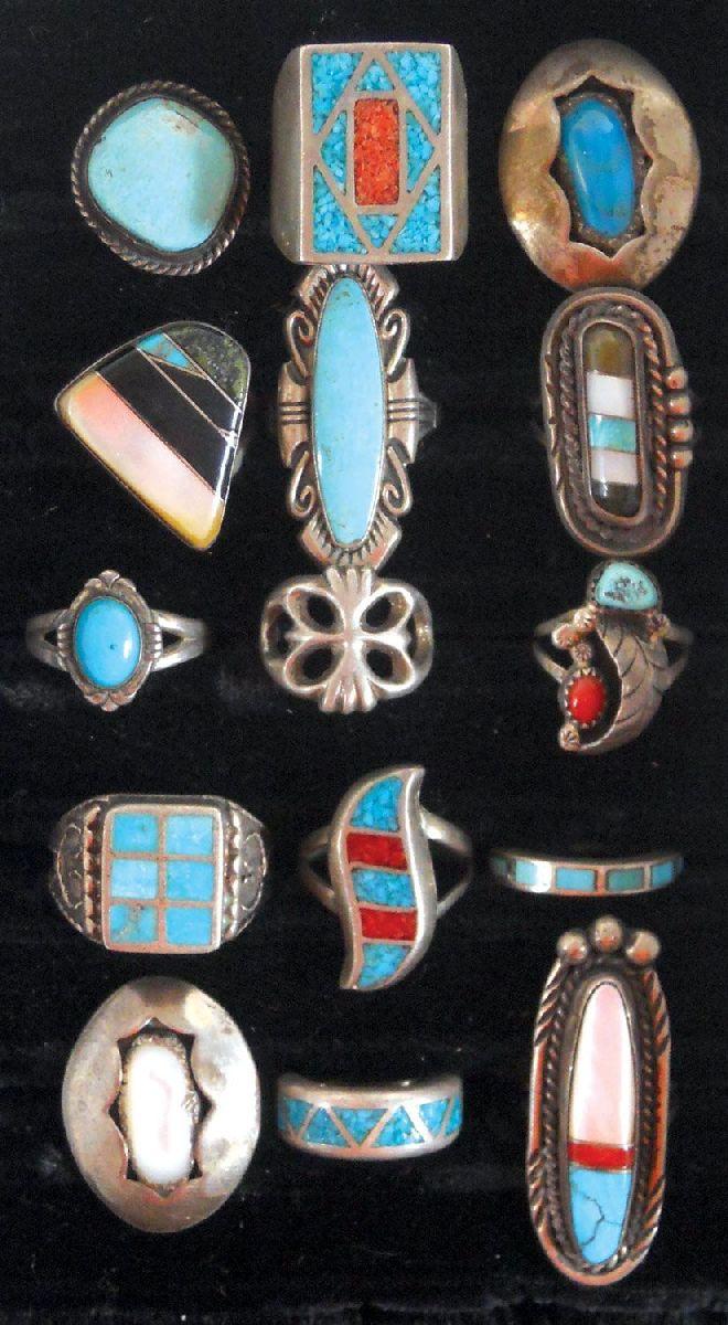 Jewelry, (15) rings w/turquoise, onyx & mother-of-pearl stones, all different styles & sizes, a great assortment in Exc cond.