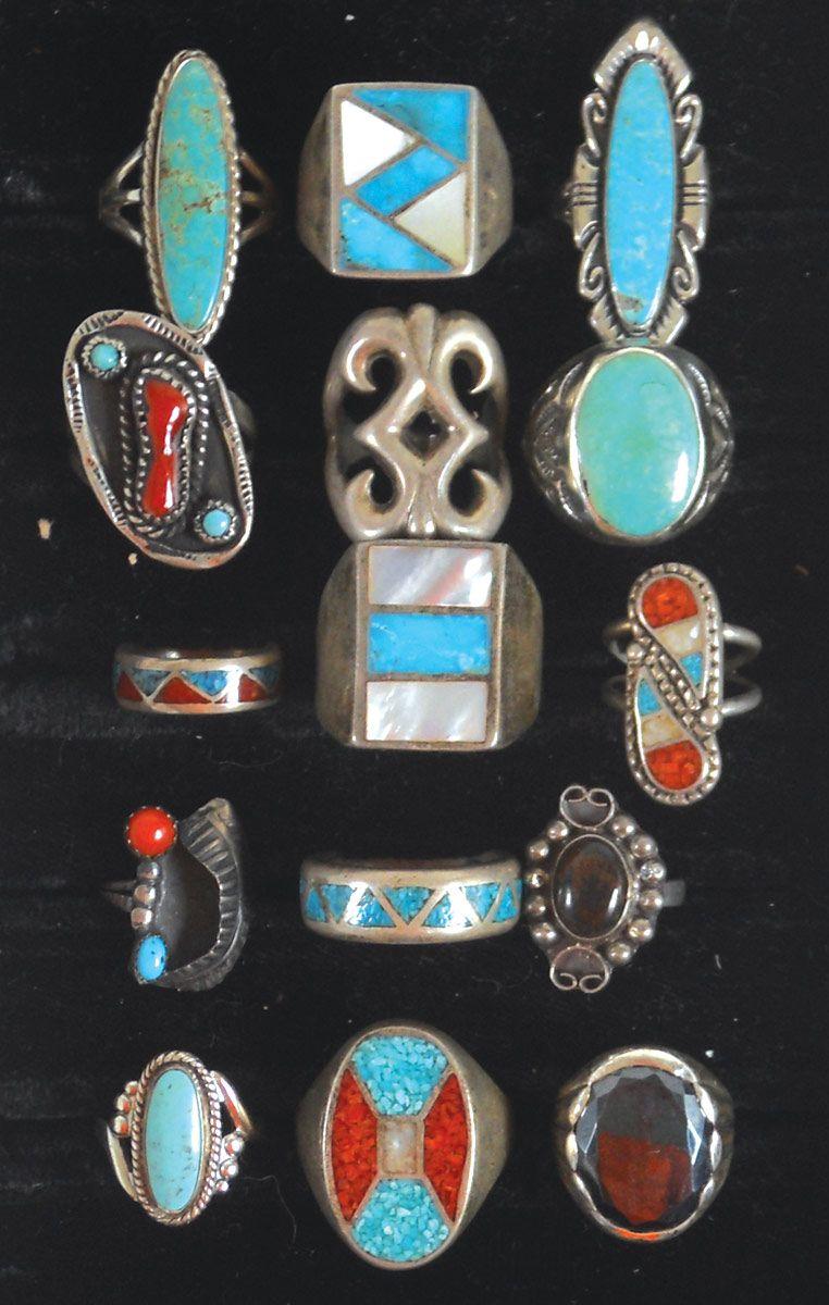 Jewelry, (15) rings w/turquoise, onyx & mother-of-pearl stones, all different styles & sizes, a great assortment in Exc cond.