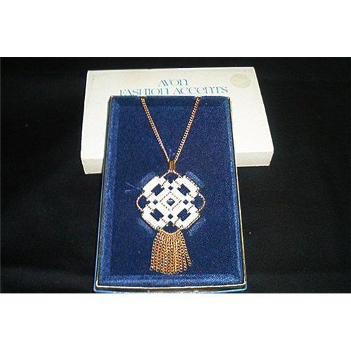 Featuring at todays auction is a beautiful necklace by Avon called "Contempora", convertible necklace/pin. The chain measures 16 inches long.The Pendant/Pin is white enamel painted with gold tone trim and beautiful tassel. Pendant/Pin measures: 2 inches long by 2 inches wide. Never worn. Still in original box which is dated 1972. Excellent Condition. A great gift for any occasion. Also a great stocking gift for Christmas.