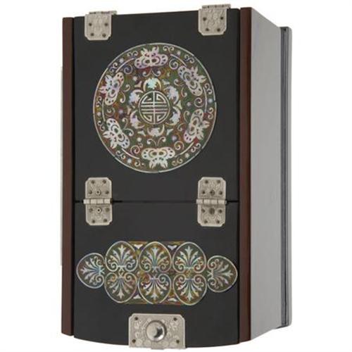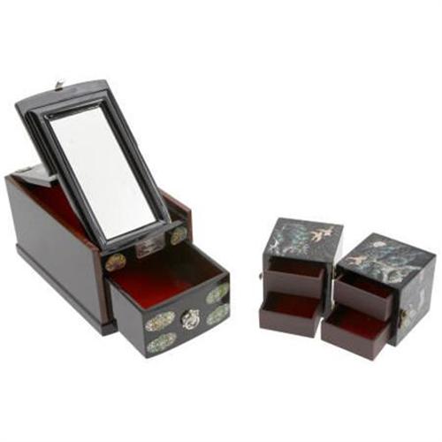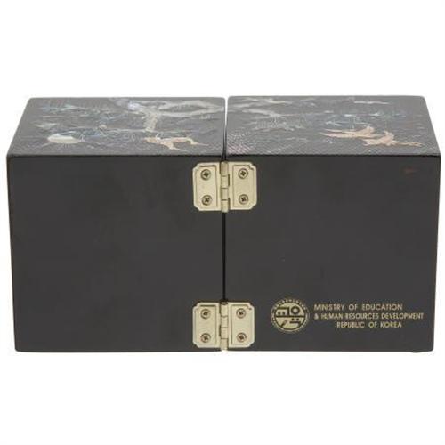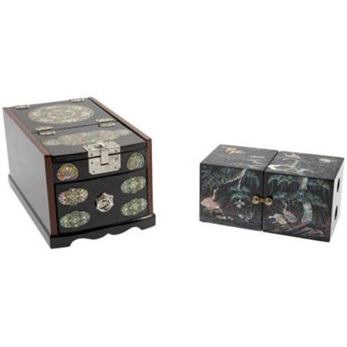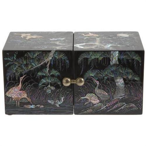 <B>Jewelry Box Collection</B></I><BR><BR>The collection includes: one hinged jewelry box, ornately designed with a birds and nature motif, enhanced by black lacquer accented by mother-of-pearl shell inlay, completed by four drawers on the interior closed by a yellow metal knob <I>(Dimensions: 6-5/8 inches x 3-5/16 inches x 3-1/4 inches)</B></I>; together with one jewelry box, highlighted by a mosaic pattern motif, enhanced by black lacquer accented by mother-of-pearl shell inlay, further accented by various colors of paint, completed by white metal closures <I>(Dimensions: 4-7/8 inches x -1/2 inches x 8-13/16 inches).</B></I> <BR><I>*Property of Sharon Bush, gift from the First Lady Barbara Bush</B></I><BR><BR><b>Shipping:</b> Miscellaneous Collectibles, Smal (<a target="_blank" href="http://www.heritageauctions.com/common/shipping.php">view shipping information</a>)