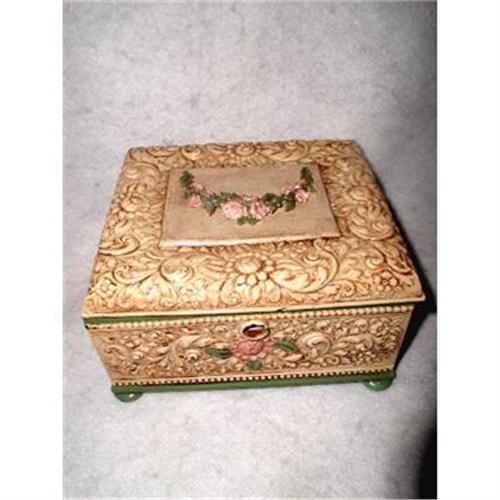 Unusual painted silver quadruple plate jewelry box in wonderful condition has a raised floral design covering the box in antique cream with darker crevices. Green and pink applied raised garland in the same metal graces the top. Matching painted designs on other four sides. Beaded trim with green banding and bun feet. Lock with no key. The interior lined in pink satin,padded lid,still in good condition. Some darkening to quadruple plate on the interior lid around the satin,the only section unpainted besides the bottom. Made by the Derby Silver Company,marked on the bottom with the anchor and crown synbol below. The number "44" above and "3462" below. This markig was only used from 1872-1898. Measures 7.25L X 4.25H X 6.25W.
