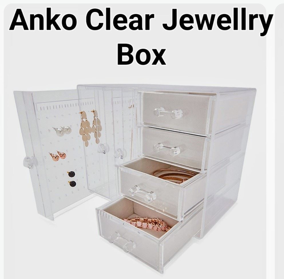 Transparent design for easy viewing, includes drawers and earring holders, new.
