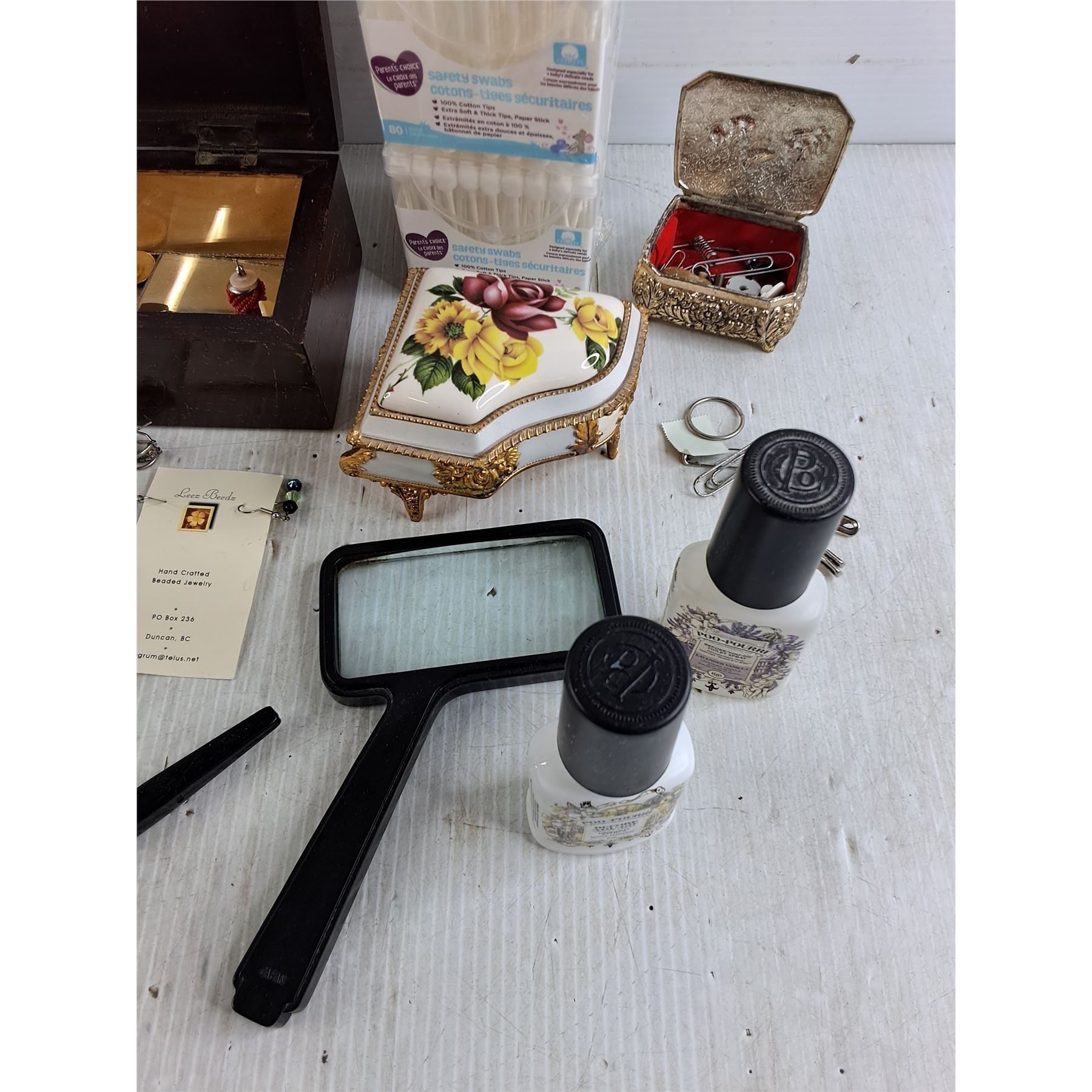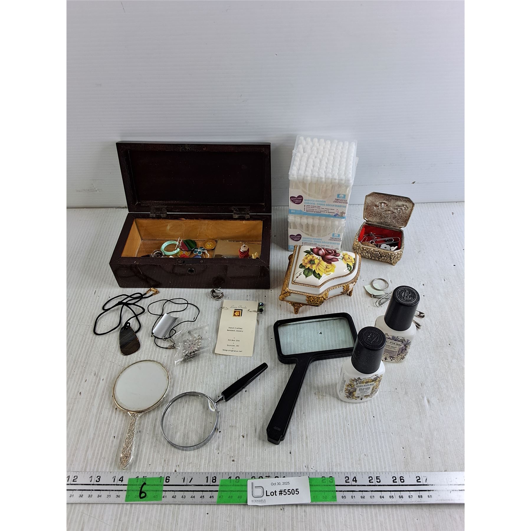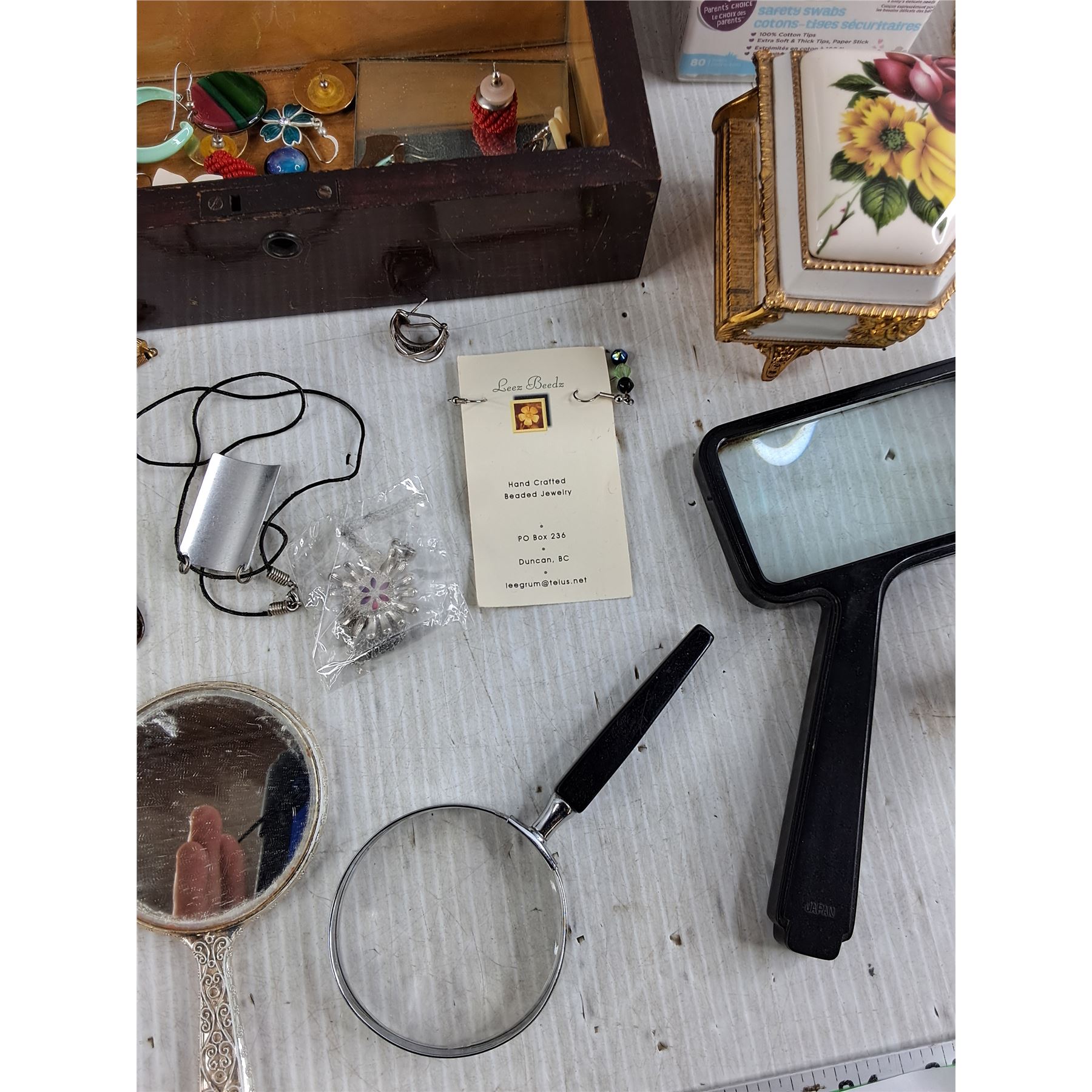 Jewelry Boxes, Magnifying Glasses, Small Mirror, Necklaces, Cotton Swabs, Earrings