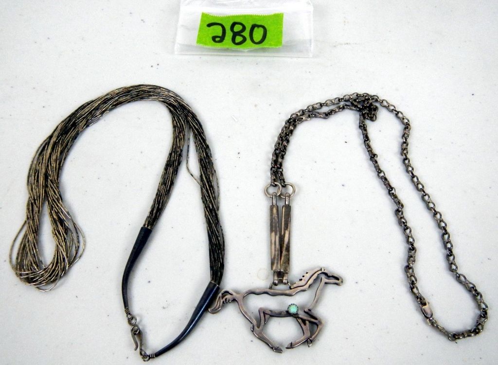 Jewelry Choice Sterling Silver Horse Necklace: This heavy sterling silver necklace weighs in at approximately 26.9g and is approximately 25" long. The horse is approximately 2 5/16" x 1.25" There is a small turquoise color stone on it also. GSNM is stamped into the horse. GS New Mexico Silver Comany The clasp is stamped 925 also. Mulit Strand Sterling Necklace: This Sterling marked necklace is approximately 23' long and weighs approximately 23.7g There are 20 strands of cylinder shaped sterling silver beads measuring approximately 3mm long x 1mm wide. They are connected to curved conical sterling silver ends with a hook and latch closure.