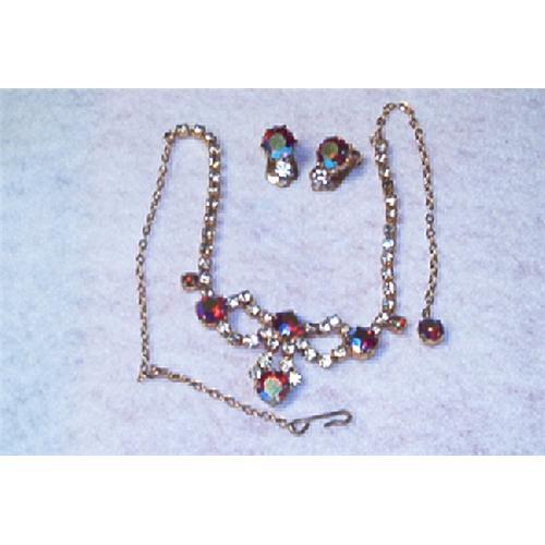 Featuring at todays auction is a beautiful, demi-parure, gold plated, tourmaline necklace with matching earrings. This is absolutely a wonderful, vintage, set. The necklace displays 4-prong settings of iridescent tourmaline glass chatons that displays colors of reds, blues, and greens, depending on movement. Also tied together with glass 4-prong clear glass chatons. Hook Closure. The extra length chain on this necklace also displays the iridescent glass tourmaline chatons. The matching clip earrings are also covered with glass iridescent tourmaline chatons, offset with 4-prong glass rhinestone chatons. Both pieces are also gold plated. The necklace measures 7 inches with the extension chain measuring an extra 2 inches. The matching earrings measures 5/8 inch long by 3/8 inch wide. This is absolutely a beautiful glass tourmaline set.