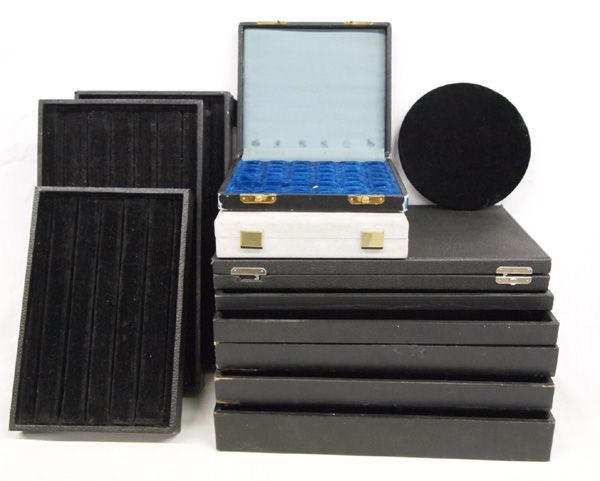 Jewelry Display Trays and Boxes. This group includes the following. 2 ring display boxes with push botton clasps, one is 7.25''x8.25''x1.5'' and has worn corners, the other is 14.75''x18.5''x1.5'' and one lock is broken. Velvet trays with corrugated holders; two that measure 8.25''x14.75''x1.75'' and one that is 11.5''x7.5''x1.75''. Two unlined display boxes that are 8.25''x14.75''x1.75''. One gray velvet lined box with heart pedestal inside that measures 8.5''x8.25''x2''. One velvet lined tray that measures 8.25''x14.75''x7/8''. One unlined tray that is 8.25''x14.75''x.75'' and one black velvet disc that is 7'' diameter x 3/8''H.