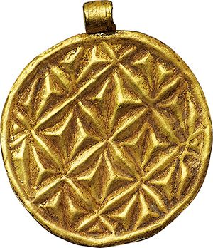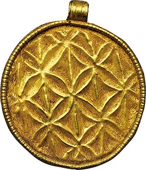 Jewelry. Gold amulet-medal. Germanic tribes, 4th-5th century AD. D/ Embossed geometric pattern. Engraved suspension hoop. 2.2 x 2.5 cm diameter. AU. g. 1.60 RRR. SPL.