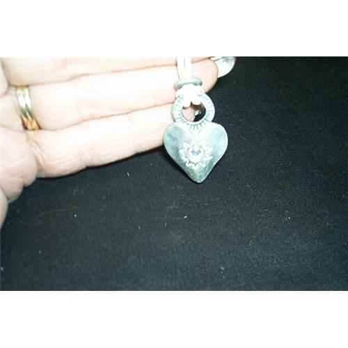 Featuring a real beauty; rope choker-necklace with the heart shaped pendant made of metal with an iridescent crystal dentelle, aurora borealis rhinestone which changes colors. Hand carved starburst design outlines the dentelle rhinestone. Above the heart there is a decorative round circle that the tiny rope attaches to. Also a very tiny metal ring encircles the rope. At the end of the rope there is a hook latch on one end and the other end of the rope is an addition tiny chain to lengthen the necklace. Measurements are: 9 inches long with the additional chain which adds an extra length of 3 inches. Fits closely to any neckline.