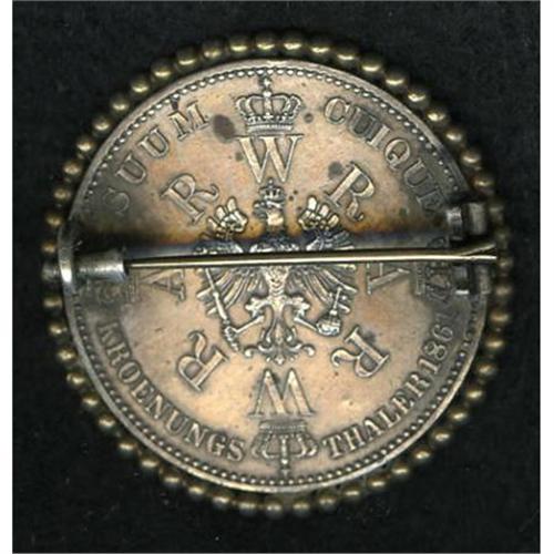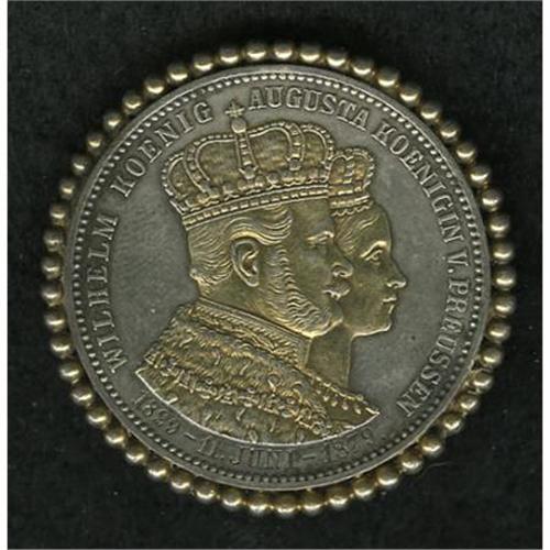 <B>50th Wedding Anniversary Pinback From 1861 Prussian Thaler.</B></I> Host coin is KM-488, an 1861 Prussian coronation thaler of William I and Augusta. Outer beaded ring and pin are attached. Hand-engraved by jeweler beneath the conjoined busts, 1829 - 11 JUNI - 1879. The date signifies their 50th wedding anniversary. The coin is cleaned, and the busts are gilt.<BR><BR><b>Shipping:</b> Coins & Currency (<a target="_blank" href="http://www.heritageauctions.com/common/shipping.php">view shipping information</a>)