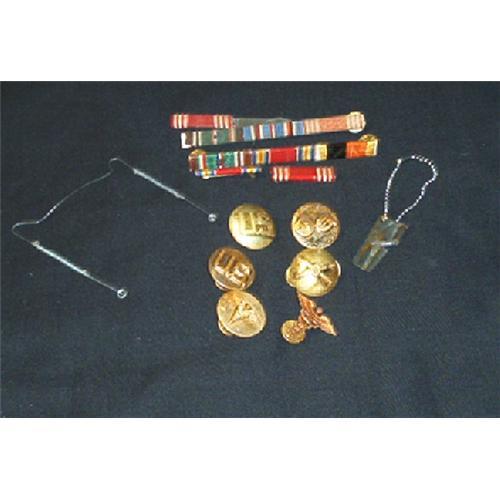 Featuring a collection of pins, ribbons, etc. Consists of 5 pins with different designs and 1 of which that has wings and appears to have two snakes crawling up the pole. 3 ribbon bars and 2 ribbon pins-one ribbon bar has a tiny bronze star on one end; The two small ribbon pins have gold tone backings with hook clasps. Also in this collection is a can opener on a chain. A small collection from my Uncle's Estate.