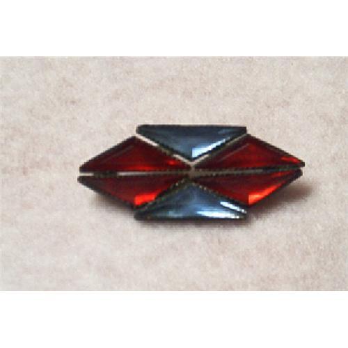 I am featuring at todays auction a beautiful, antique, pot metal Brooch or Pin. Contains 4 ruby red, triangle designed rhinestones and 4 blue rhinestones. Each rhinestone has a tiny beaded metal that separates each triangle rhinestone. The backing has a C-Clasp closure and you can see the pot metal very clear. Also has been handset and the potmetal has been hand sodered. A very unique, vintage brooch or pin.