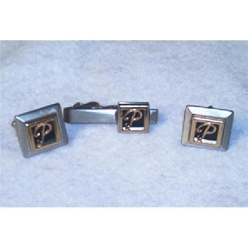 I am featuring at todays auction a beautiful set of SWANK tie tacs and Cuff Links. Each piece has the initial "P". Beautiful silver and gold plated square in design. The back of each piece is signed: SWANK, S.O. The tie clip measures 1 5/8 inches long by 1/2 inch wide; the cuff links measures 3/4 inch diameter; The initial "P" and the frame around this initial is gold plated with the background colored dark brown. All three items are in excellent condition.