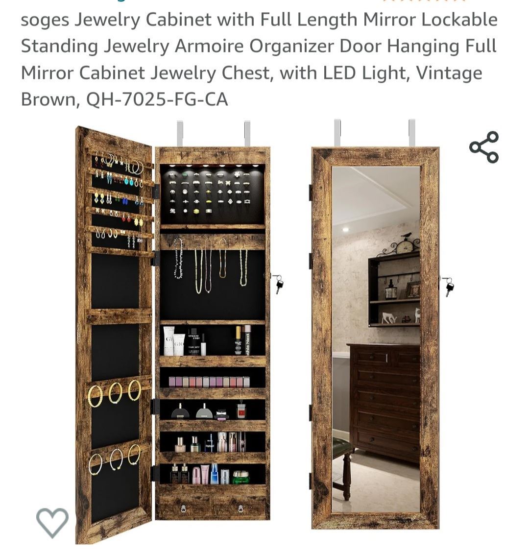 Lockable standing armoire with interior LED light and ample storage, vintage brown finish, new.
