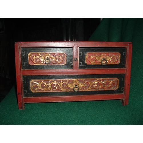 Converted from Chinese incense storage box. 2 small drawers, 1 large, all with carved facing. Finished in traditional Chinese red, gold and black. 14.75"W x 8.75"D x 8.75"H