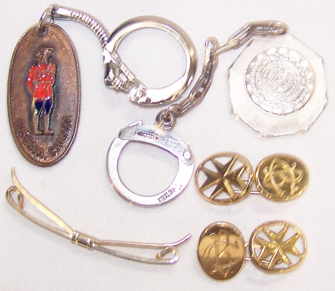 Includes two key chains, a tie tack, and a pair of cuff links marked "BC".