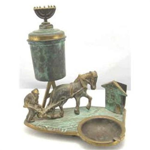 This is a throwback to the 50's. A combined Cigarette Holder with a minorah on the top, a Match Box Holder and an ashtray. All with an integral verdigris finish and a hebrew word across the front. Two original labels on the bottom, each with hebrew wording.