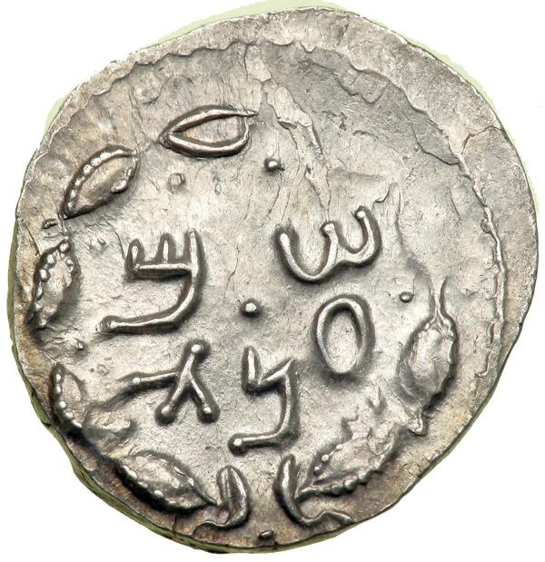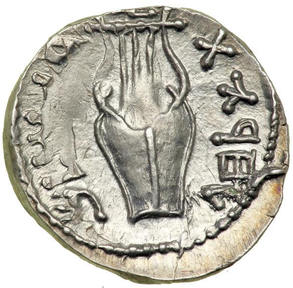 Jewish Coinage. The Bar Kokhba War, 132-135 CE. AR Denar (3.26 g) attributed to year 3 (134-135 CE). Palaeo-Hebrew inscription "Shim'on" within wreath topped by a medallion and terminating in ribbon ties. Reverse: Kithara (elaborate lyre with sound-box) with three strings; around, Palaeo-Hebrew inscription "For the Freedom of Jerusalem". Mild 130; H-1429. Some luster. Extremely Fine. .