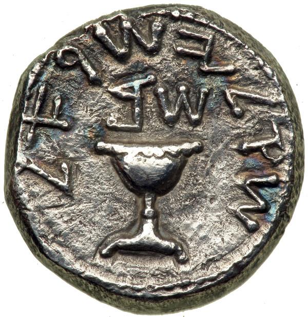 Jewish Coinage. The Jewish War, 66-70 CE. AR Shekel (13.05 g) dated Year 2 (67-68 CE). Temple vessel (omer cup?) with rim decorated with eight or nine pearls; above, date and surrounding Palaeo-Hebrew inscription "Shekel of Israel". Reverse: Stem with three budding pomegranates; around, Palaeo-Hebrew inscription "Jerusalem the Holy". AJC II, plate 17, 8; H-1358. Surfaces lightly disturbed. A well-centered shekel with complete legends. Very Fine.